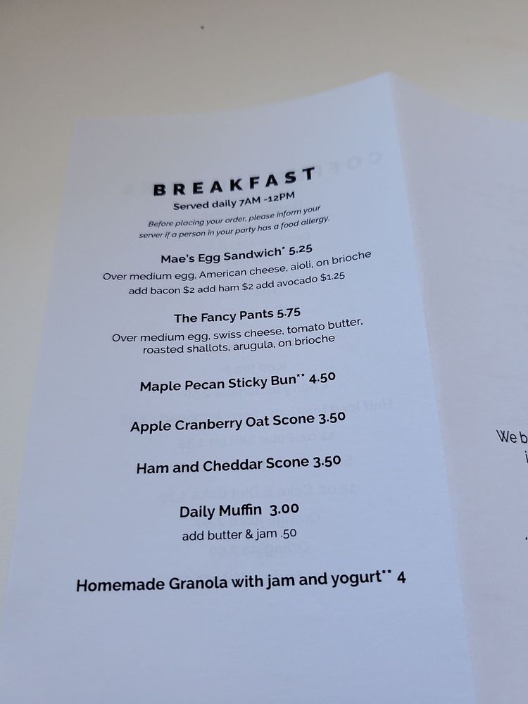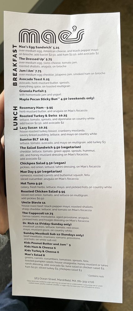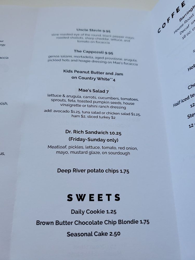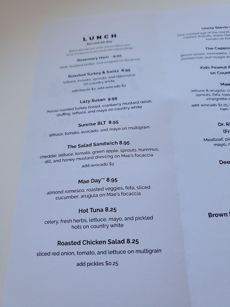 Mae's Sandwich Shop Menu